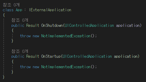 11. IExternalApplication 인터페이스를 상속받으면 OnStartup, OnShutdown 메소드를 구현해야 한다.