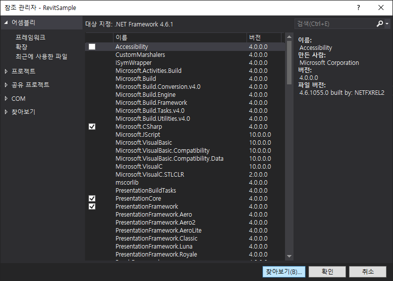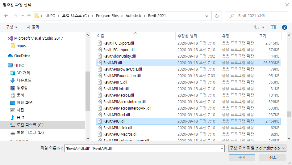 8. RevitAPI.dll, RevitAPIUI.dll 선택 - 확인