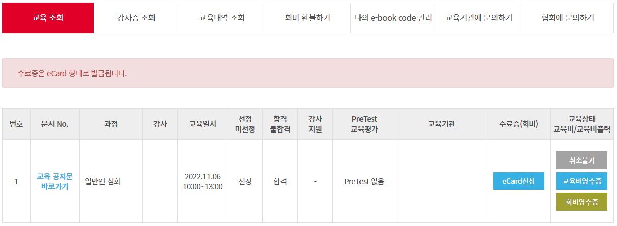 며칠 기다리면 4번 사진에서 수료증(회비) 칸에 eCard 출력 버튼이 생긴다.