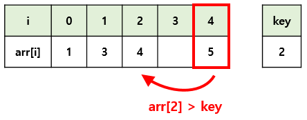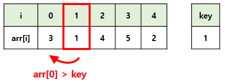 3) 이전 값(arr[0])이 key값보다 크므로, 값을 뒤로 한칸 이동시킨다.
