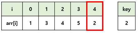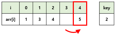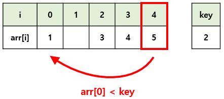 4) 더 이상 이전으로 이동할 수 없으므로, 비교를 끝내고 저장해놨던 key값을 arr[0]에 설정한다.