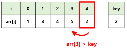 11) arr[3]값이 key값보다 크므로, 값을 한칸 뒤로 이동시킨다.
