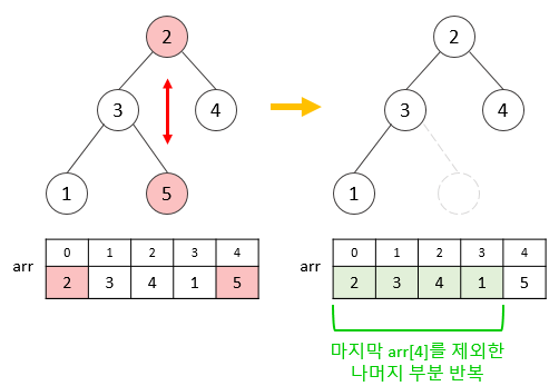 하지만 루트와 마지막 노드만 교환한 것이므로 루트노드 ~ 교환된 쪽 방향의 노드들만 비교하면 된다.