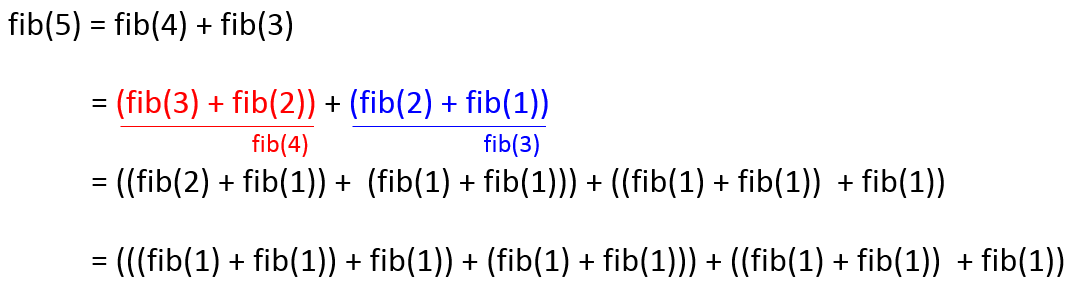 피보나치의 다섯번째 항을 구한다고 하면, 계산은 다음과 같다.