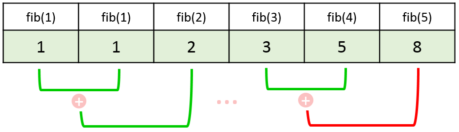 하위 값을 계산하면서 미리 저장해놓으면 fib(5)는 앞의 두 값만 더하면 구할 수 있다.