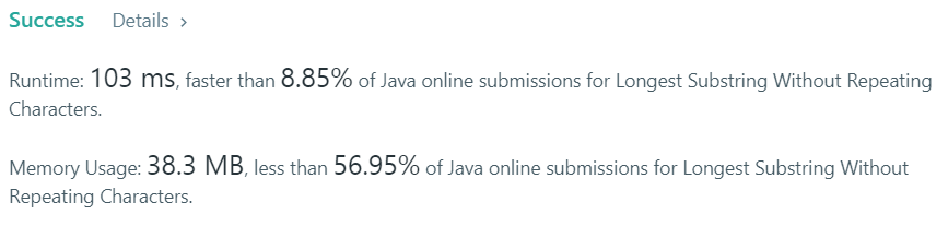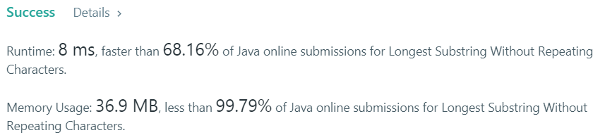 // Memory Usage: 38.3 MB, less than 56.95% of Java online submissions for Longest Substring Without Repeating Characters.