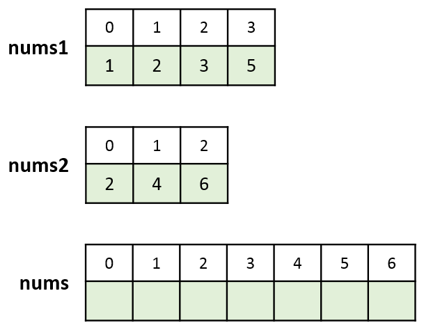 1) nums1과 nums2의 길이를 더한 만큼의 크기로 배열을 생성한다.