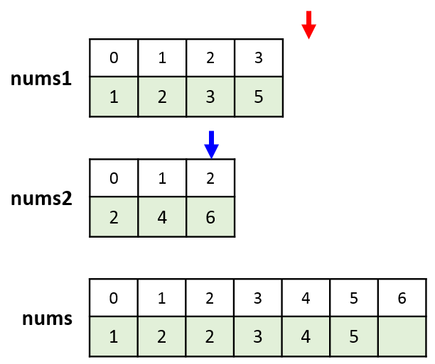 4) 2~3 작업을 반복하게 되면 nums1 끝까지 비교가 끝나 위와 같은 결과가 나온다.