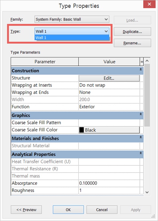 (Revit의 Type Properties창)