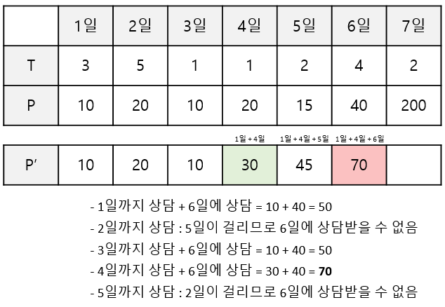 6) (6일을 포함하여) 6일까지 상담했을 때 최대 금액은 70이다.
