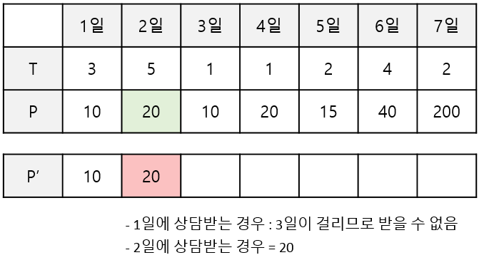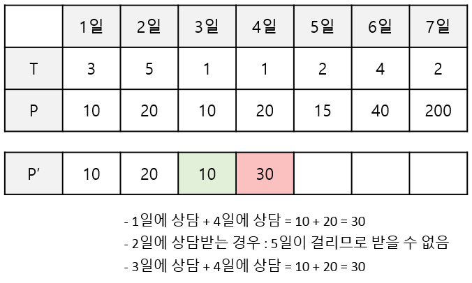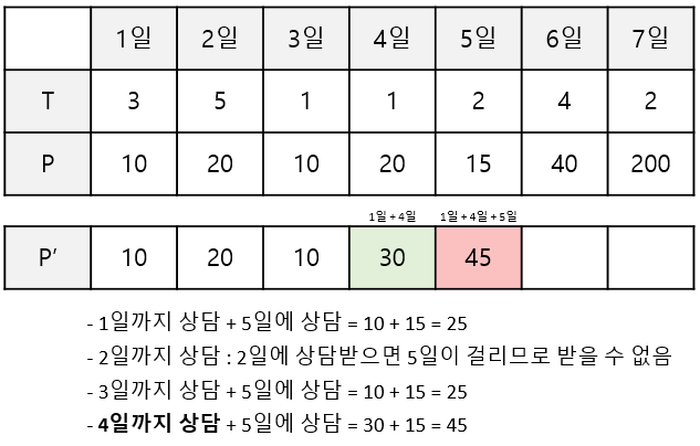 1일까지 상담했을 때 최대 금액, 2일까지 상담했을 때 최대 금액을 차례로 더하여 저장해놓는다.